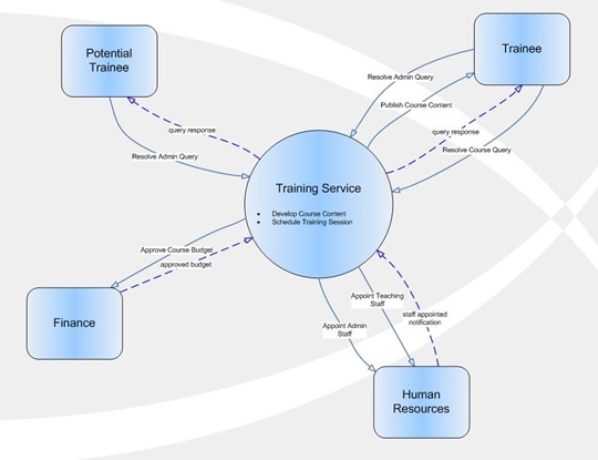 The organisation should identify all internal and external stakeholders that consume services or receive deliverables for decision making. Use a context diagram to identify business processes that support service production and consumption, and/or information submission and provision. In the process context diagram below, continuous flow lines represent process names and dashed flow lines represent information flows.
